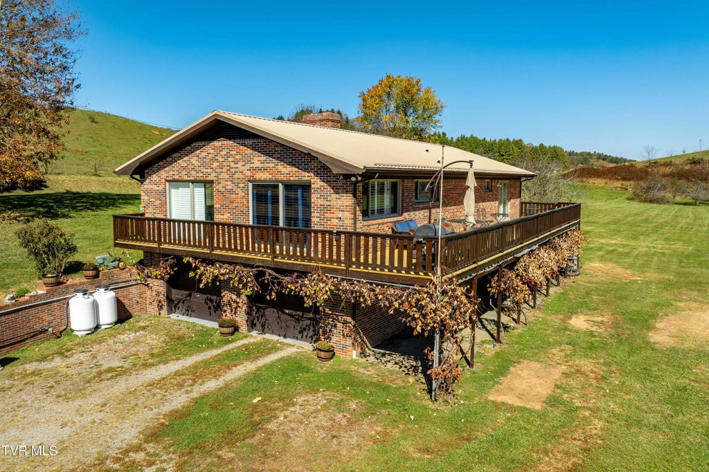 1- MAIN BRICK HOUSE ONE STORY HAS A LEVEL ENTRANCE, FOYER, LIVING ROOM WITH BRICK FIREPLACE, LOTS OF WINDOWS, LUXURY VINYL FLOORS, 3 BEDROOMS, 2 FULL BATHS (ONE PRIVATE BATH IN MASTER BEDROOM WITH SLIDING GLASS DOOR TO DECK) (ONE BATH WITH GARDEN TUB), KITCHEN WITH NEW GRANITE COUNTERS, CABINETS, NEW LARGE SINK, WINDOW WITH WITH GREAT MOUNTAIN VIEWS, DINING ROOM WITH LOTS OF WINDOWS TO VIEWS, LAUNDRY ROOM, LARGE FULL BASEMENT FOR POSSIBLE 4 BEDROOM & ALREADY PLUMBED FOR THIRD BATH WITH INSULATION AND DRYWALL INCLUDED, 2 CAR ATTACHED GARAGE, NEW GENERAC 22KW WHOLE HOUSE GENERATOR, NEW 3.5 TON HVAC, HUGE DECK REDONE, PICNIC TABLE, NEWLY PAINTED INSIDE HOUSE, RV PARKING AREA, GRAPEVINES, FRUIT TREES, LEVEL PASTURE LAND, CREEK ON PROPERTY AND BEAUTIFUL MOUNTAIN VIEWS!