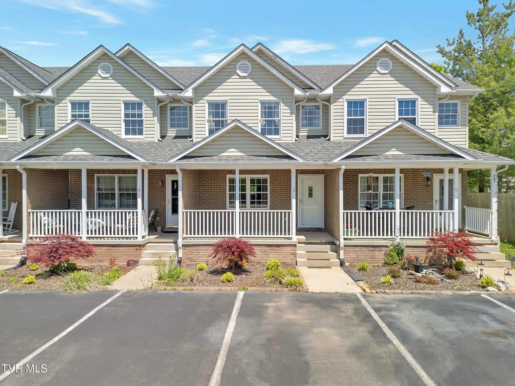 This spacious 2-bedroom, 1.5-bath condo is tucked just outside the Elizabethton city limits, offering beautiful East Tennessee mountain views and low-maintenance living. Step inside to find a large open living area and a cozy fireplace. The kitchen has plenty of storage with a pantry and there is a half bath on main level perfect for guests. Upstairs, you'll find two oversized bedrooms, each with walk-in closets, along with a full bath and a laundry room for added convenience. Out back, enjoy a private screened-in porch plus a second open patio — a perfect spot for relaxing or entertaining. The HOA covers all exterior maintenance, roof, lawn care, and pest control for just $135 a month. Property CAN be a rental. Located across from the scenic Watauga River and surrounded by mountain views — all without city taxes or state income tax. Don't miss this great opportunity to own a low-maintenance home in a peaceful setting!