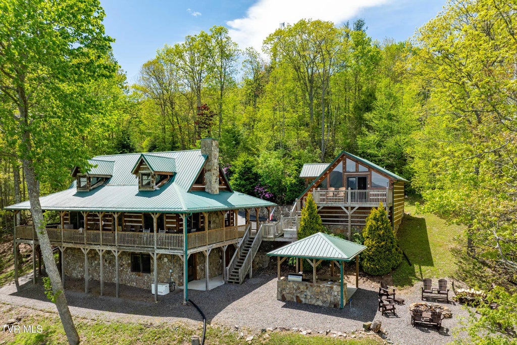 Resting at an elevation of 4,233 feet, this stunning custom hand-hewn log home offers panoramic views of the mountains of North Carolina, Tennessee, and Virginia. The generous great room features a dramatic floor-to-ceiling stone fireplace with gas logs, flowing seamlessly into a chef's kitchen equipped with Jenn Air stainless steel appliances, granite countertops, and custom cabinetry. The main-level primary suite boasts double vanities and serene mountain views. Upstairs, a versatile loft space—perfect for a home office—complements a large, light-filled bedroom and a full bath. The lower level is an entertainer's dream, featuring a custom granite-topped bar, a second gas fireplace, a handcrafted pool table, and an intimate wine cellar and tasting room with custom cabinetry. A bonus/sleeping room (currently used as a bedroom) and a full bath complete this level. Above the two-car garage is a 780 sq ft guest apartment currently operating as an Airbnb. It includes a king-size bed, cozy sitting area with gas fireplace, kitchenette, and full bath—ideal for guests or rental income. Exceptional outdoor amenities include a 1,490 sq ft covered wrap-around deck, a covered outdoor kitchen with a 52'' Viking gas grill, refrigerator, sink, fire pit, and an 8-person hot tub—all designed to take full advantage of the breathtaking scenery. Practical features include a propane-powered whole-house generator, metal privacy gate, water filtration and softening system, exterior security cameras, and tasteful outdoor lighting. Located near the NC High Country with the benefit of lower taxes and county-maintained roads. Furnishings & an ATV convey with an acceptable offer. Whether you're seeking a primary residence, second home, or income-producing rental, this property delivers unmatched luxury, comfort, and views. Seller's plans have changed. Call today for your private tour. Information sourced from tax & seller's information. Buyer/buyer's agents encouraged to verify.
